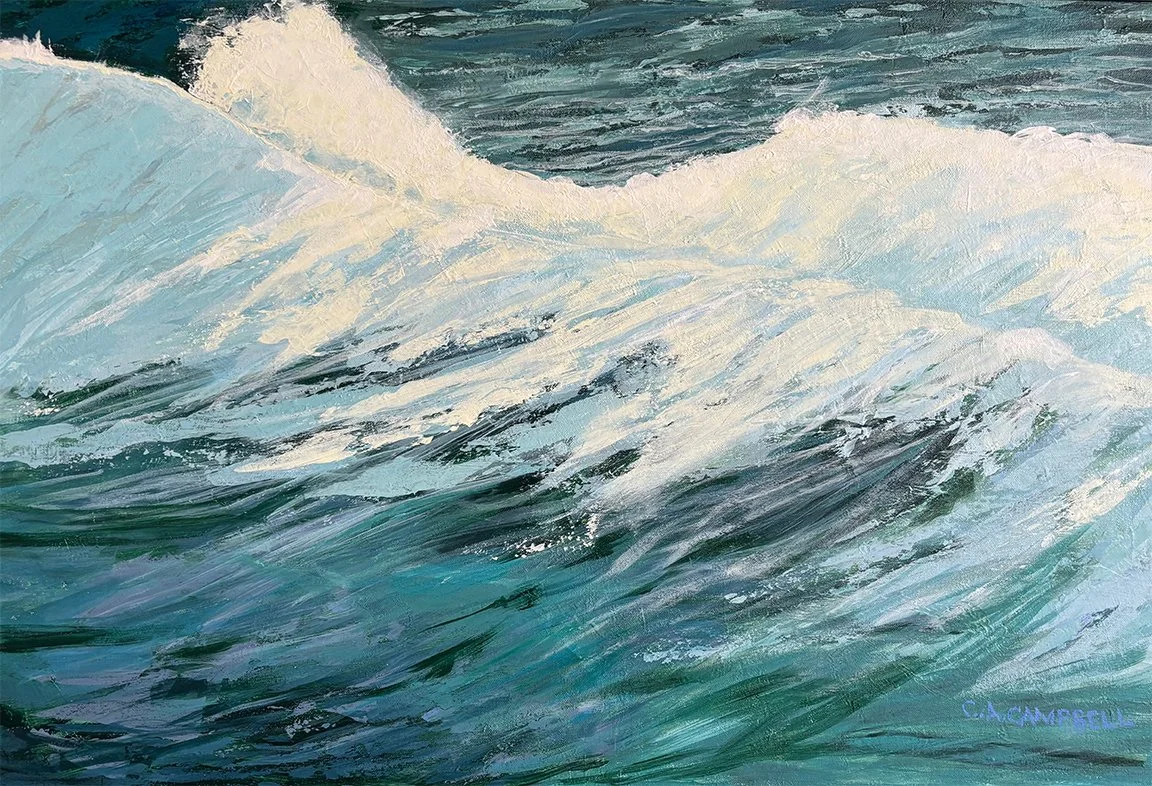 Comment from Ms. Eplstein: What hits me is the brush work, the energy and color. It is not always easy to catch the color and shape of the waves. In this one you can feel the movement of the wave coming up and curling.