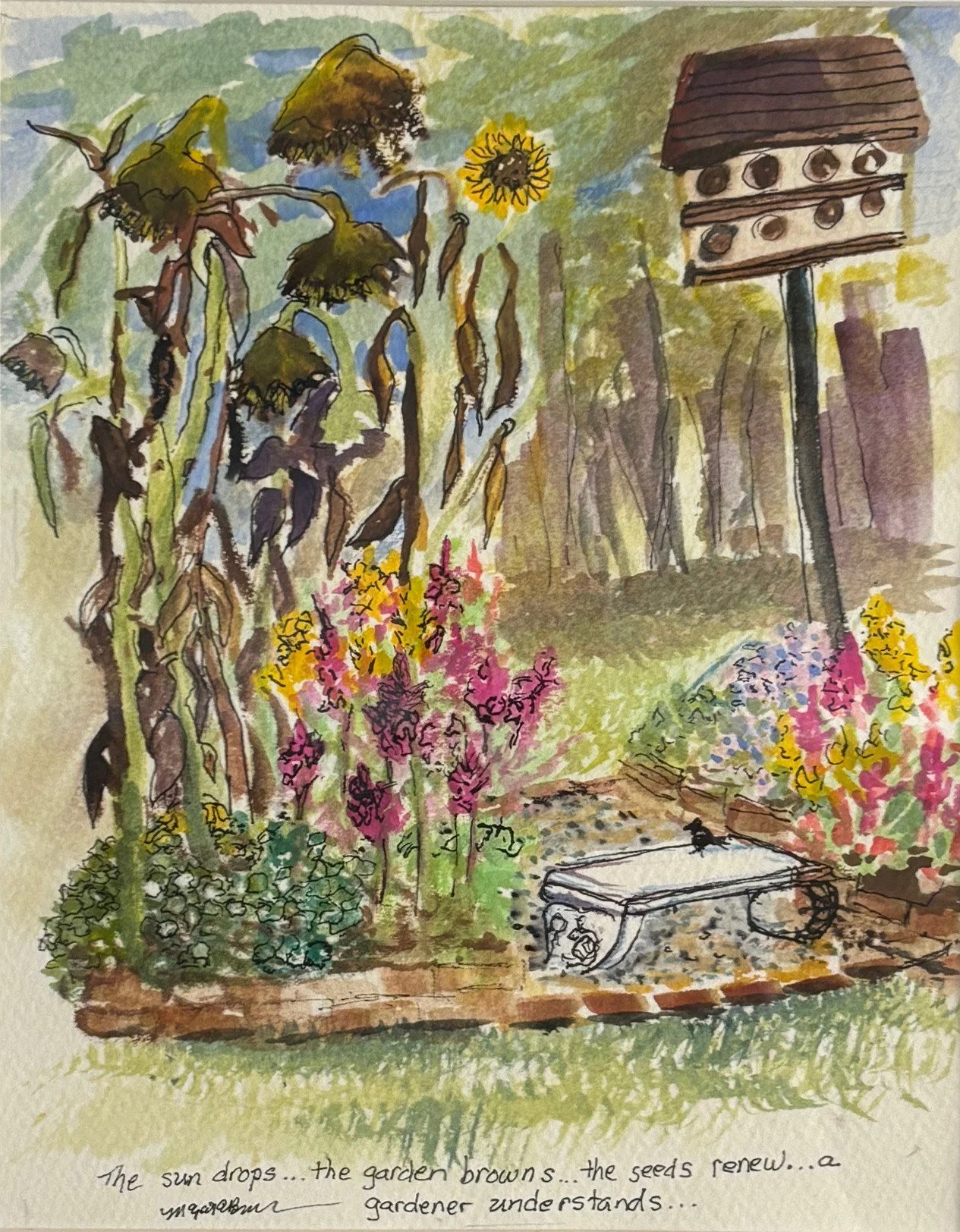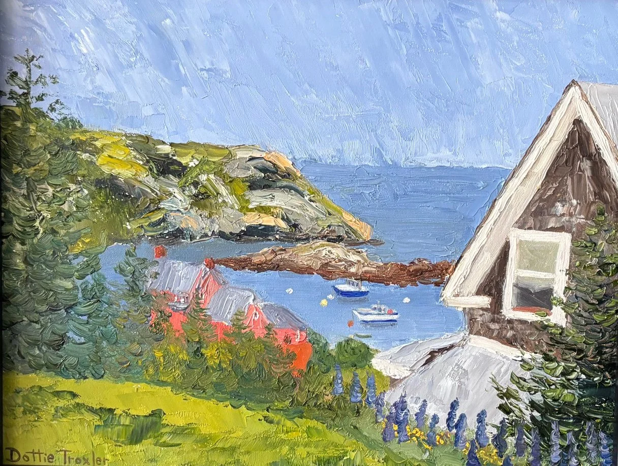 Comment from Ms. Eplstein: This has an immediacy like you’re driving down a road in Maine and you want to stop a while. I like the shingled house in the bright light. The colors of the flowers and house peeking out look like a place you could sit on a hill and watch the day go by. This artist has created a strong sense of space.