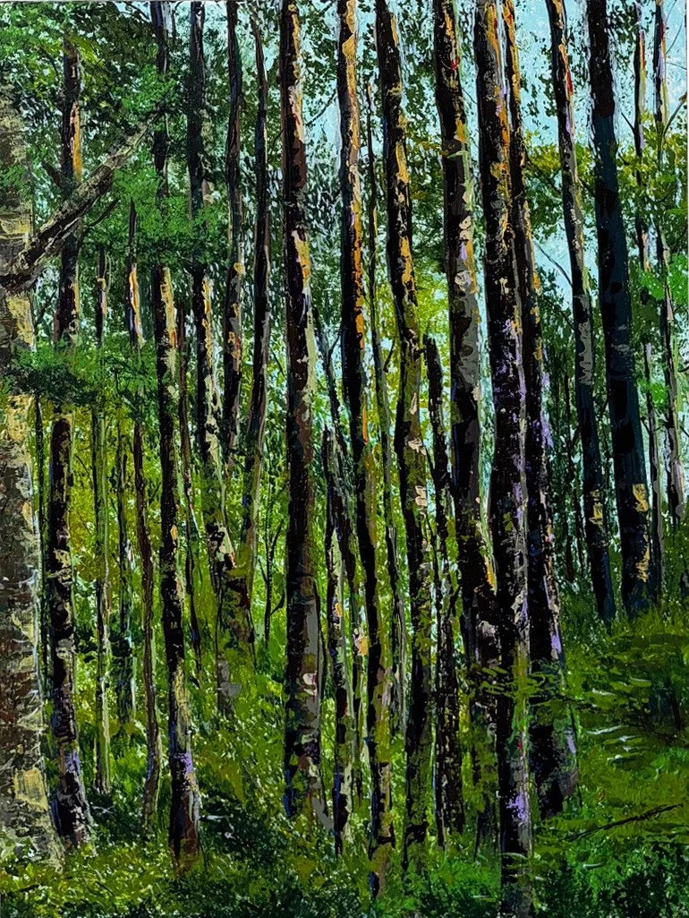 Comment from Ms. Eplstein: Reminds me of Welliver, I never really liked him but when you get up close to this piece, like him, she has made sense of the complicated masses, and the color notes are fun. I like the way it all works together and feels like you are in the woods in the middle of the day with a strong sun on you.